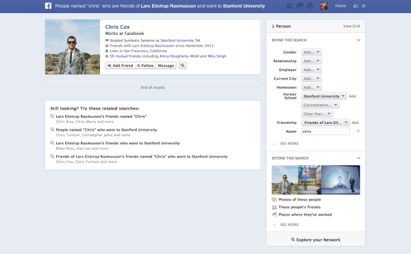 E’ importante sottolineare che il motore agisce esclusivamente sulla propria rete sociale, quindi sarà impossibile avere risposte su utenti che non sono nella nostra lista amici, questo ovviamente per un mero discorso di privacy. Non mancheranno filtri per escludere determinati parametri dalle ricerche e renderle così più mirate ed approfondite.