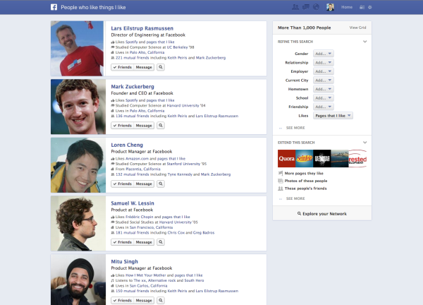 Creare un motore di ricerca tradizionale basato su Facebook sarebbe stato impossibile, ribatte Zuck, per il fatto che molti contenuti condivisi sul social network non sono pubblici. Graph Search invece è qualcosa di diverso, una funzionalità incentrata sulle foto, sui luoghi, sugli utenti e sulle pagine condivise.