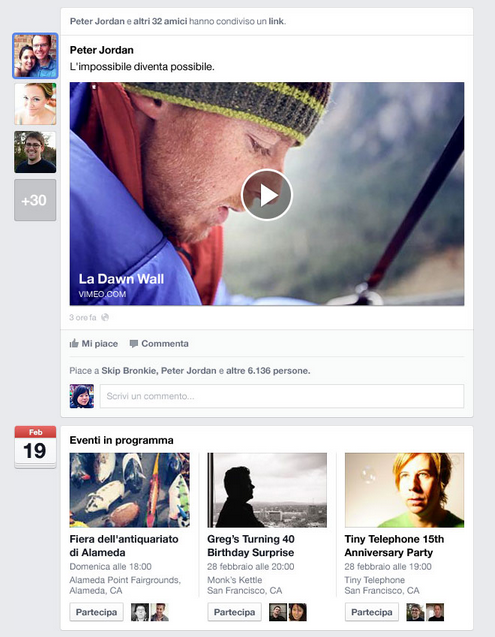 Ampio spazio viene dato proprio a foto e video, che occuperanno una porzione più grande dello schermo, così come gli aggiornamenti di stato che verranno resi più visibili. Novità anche per gli eventi che verranno raggruppati in base a determinati criteri e non più visualizzati singolarmente come succede attualmente.