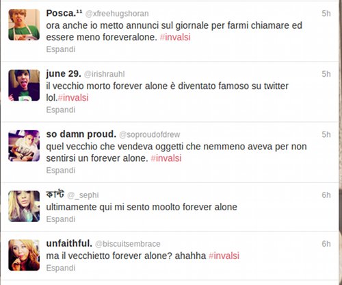 Da notare che i tweet che si riferiscono al triste vecchietto sono tutti accompagnati dall’impietoso hashtag #foreveralone.