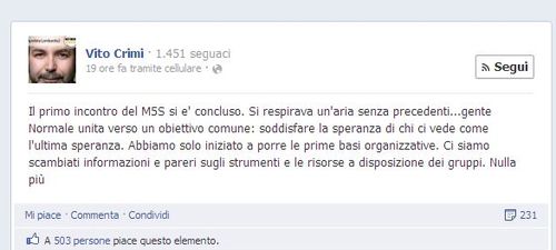 Perciò ci sembra un fatto curioso che gli onorevoli Manlio Di Stefano e Paola Carinelli e il senatore Vito Crimi siano stati beccati a pubblicare il medesimo status quasi contemporaneamente, una specie di copia e incolla virtuale che non è passato inosservato, sempre in nome della trasparenza. E tra i commenti dei sostenitori qualcuno comincia a chiedersi quali siano le modalità di comunicazione del Movimento 5 Stelle e se questi post siano stati concordati “dall’alto”.
