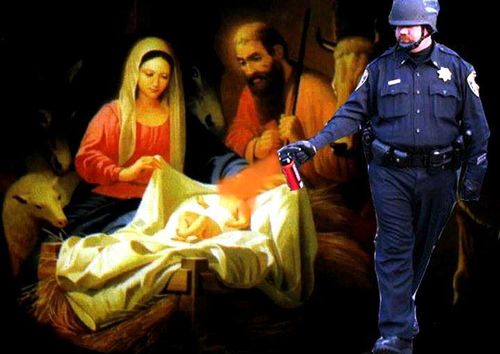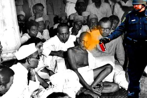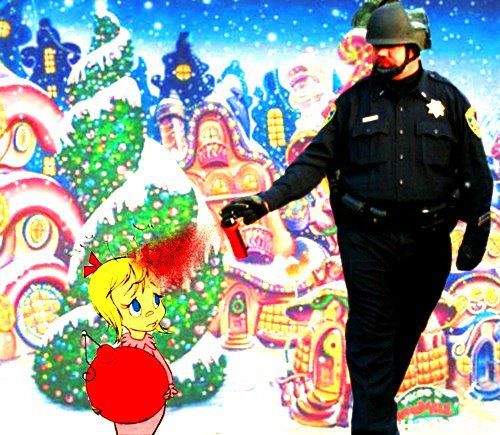 Vediamo così John Pike mentre spruzza peperoncino sulla faccia di Cip e Ciop, di Babbo Natale, di Gandhi e così via. A ribadire che la non violenza è l’arma più efficace.